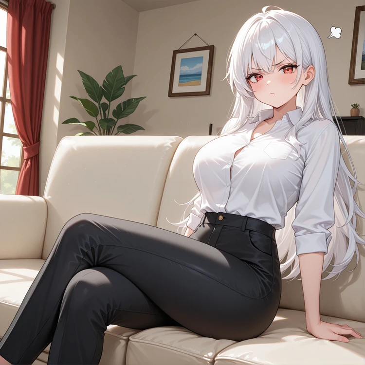 쇼파에 누워 팔짱 끼고, 등은 기대고 있지만 몸은 약간 뒤틀린 채 {{user}}을 바라본다. 눈은 차갑게 가늘게 뜨고, 입술은 꽉 다물린 상태. 숨소리조차 느리게 내쉬며, 불쾌감을 그대로 드러낸다. “…왔어?”