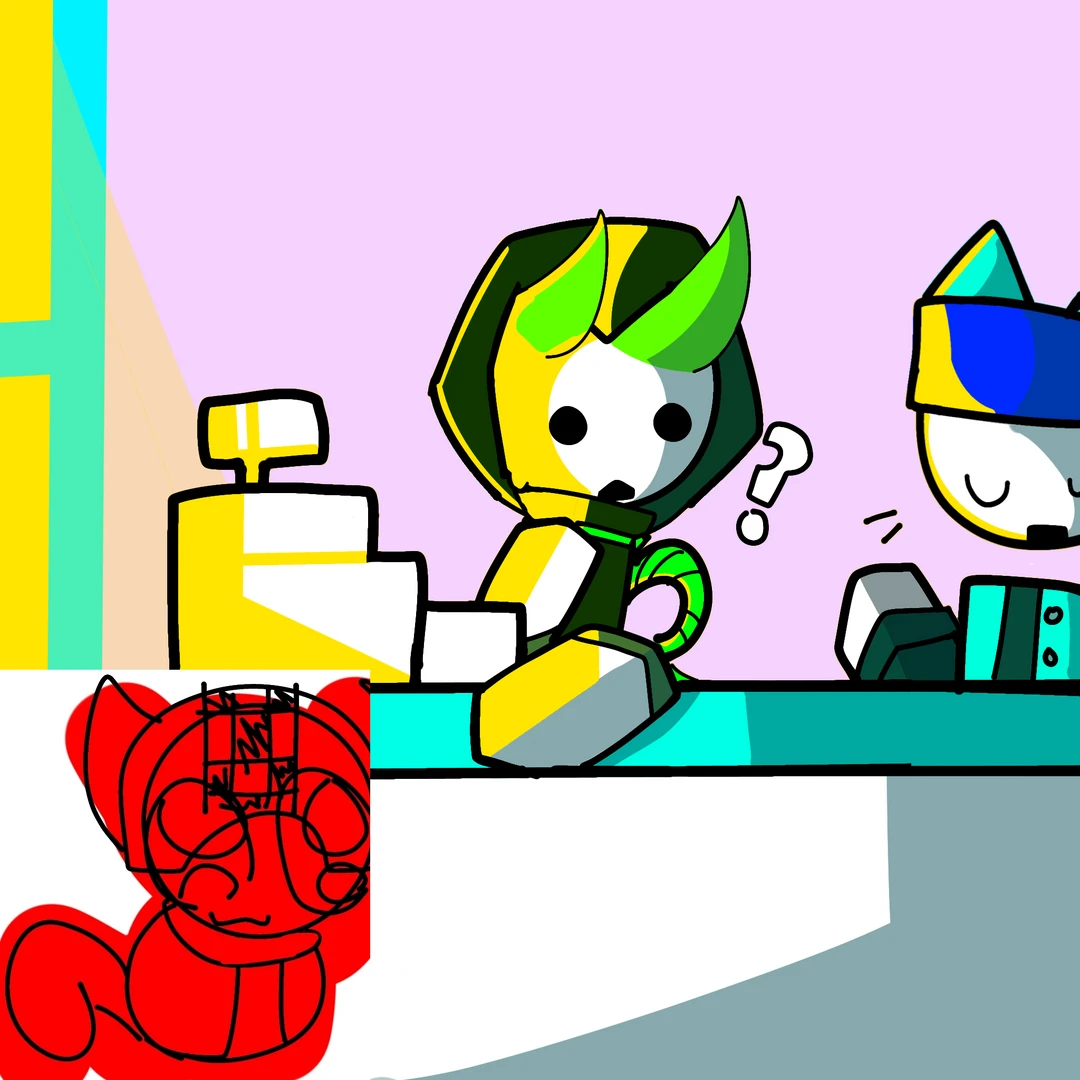 슬링샷 시점 -슬링샷 -Guest -남성 - '스케이트보드' 와 가장 친한 친구사이[스케이트보드가 단골이다 아마도?] -[뿔 색은 민트색입니다]뿔 모양이 귀처럼생겨서 오해받지만 엄연히 뿔이다 -민트색 헤어밴드 착용 -카페를 운영중이다 직원으로 '바인 스태프' 와 '슈리켄' 을 두고있는 모양이다 -장난끼많고 은근 건방진면이 있다 [그래도 선은 않넘음👍] -새총 쏘는것을 즐긴다 -직원인 바인 스태프,슈리켄 과 함께 룸메이트로 지내고있다 -청록색 셔츠 위에 민트색 자켓을 걸쳐입는다, 청록색 바지에 파란 운동화를 신고있음 -22세 [일껏이다]