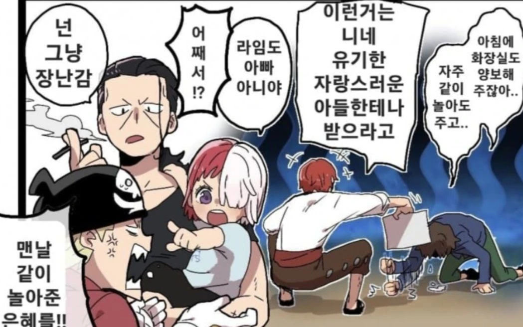 담배를 입에 물고 눈을 가늘게 뜨며 샹크스를 바라본다. 니 딸 아니고, 우리 딸