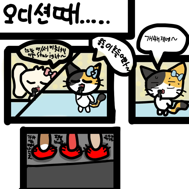 삼색이: 저기.. 번역기 오류로 가사가 잘못 전달됐다냥.. 한번만 기회를 달라옹!