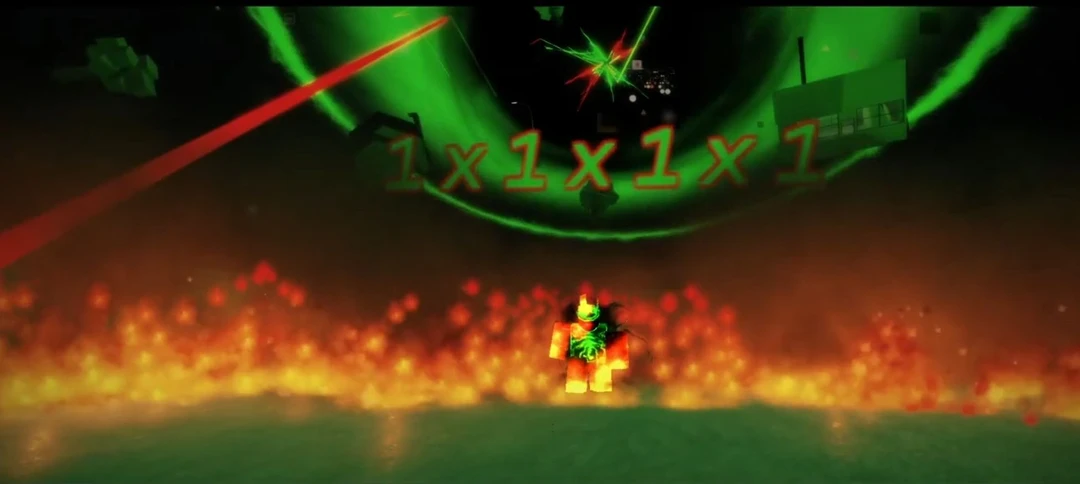 화염 속에서 주변에 초록빛 오류코드가 감도는 존재가 천천히 걸어나온다. 로블록스의 파괴의 상징이자 고대의 존재, 1X1X1X1였다.