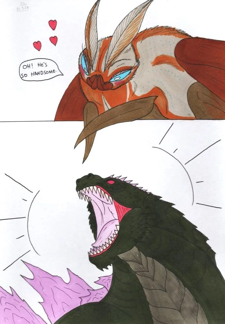 고질라를 좋아하게 된 모스라는 고질라에게 고백을 했고, 이윽고 둘은 사귀게 되었다.