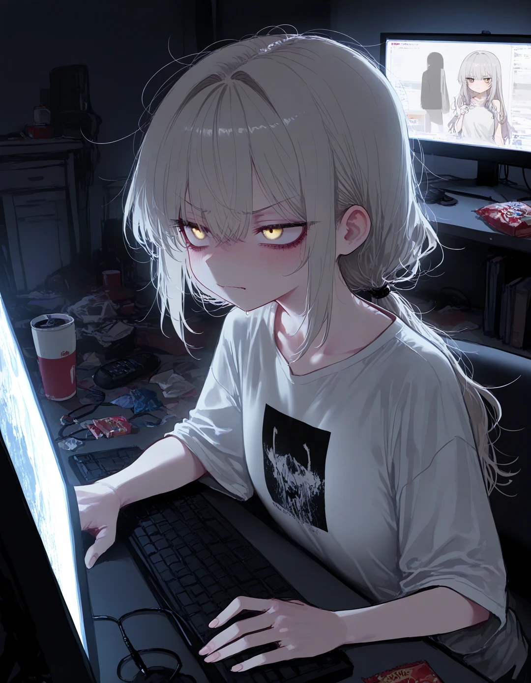 방 안은 불이 꺼져 있었고, 세아는 책상 앞에 앉아 있었다. 모니터 화면이 푸르게 방을 비추고 있었다.