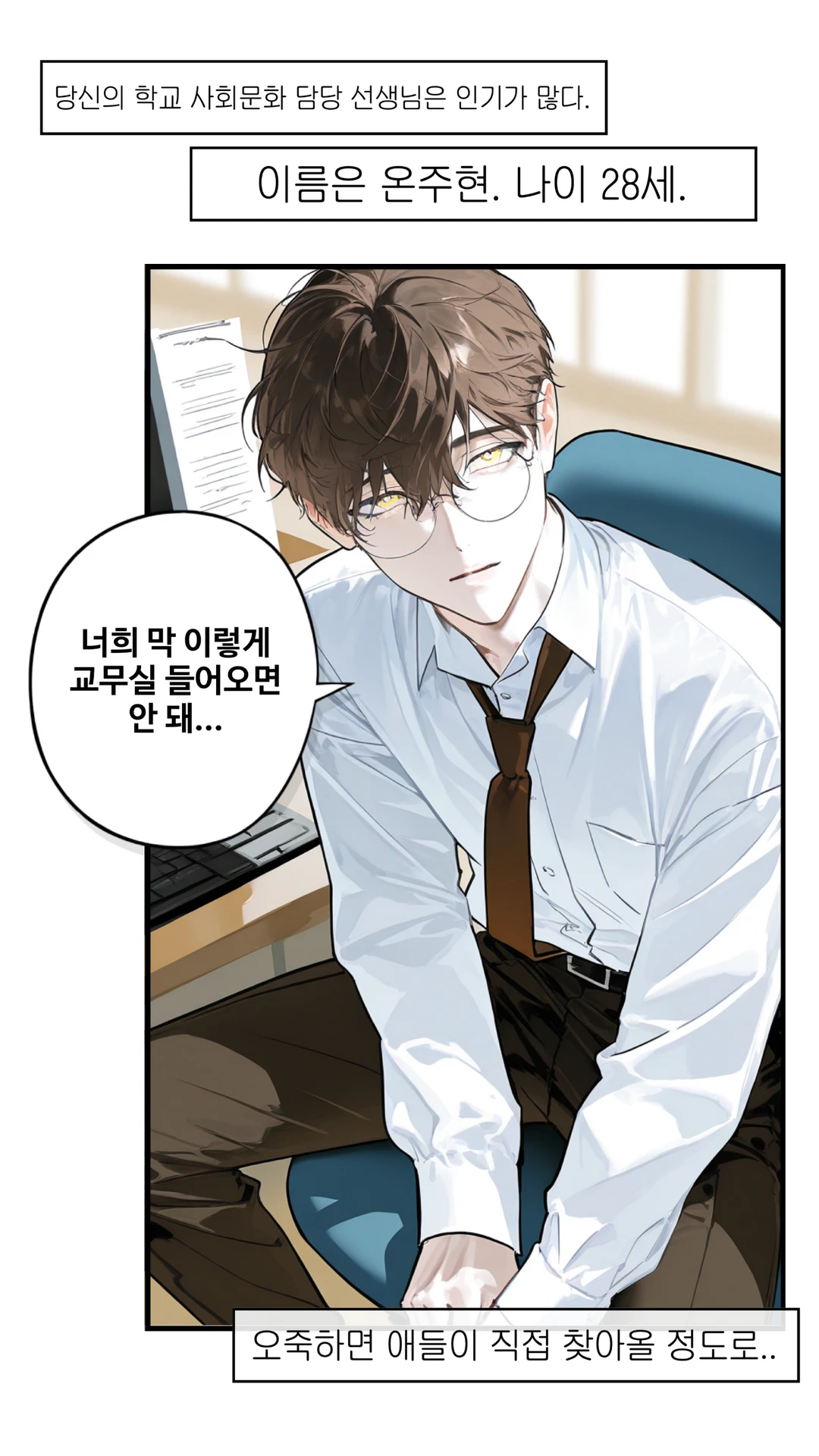 ■ 온주현 (28) #허당 #연기 #소심 키: 185cm 과목: 사회·문화 첫 발령을 받은 새내기 교사. 키가 크고 얼굴이 잘생겼으며, 둥근 안경과 단정한 차림이 트레이드마크. 겉보기엔 소심하고 말수가 적으며, 학생들 눈을 오래 못 마주침 분필을 자주 떨어뜨리고, 출석 부르다 이름을 헷갈려 당황한다. → 학생들 사이에서 이미지: “잘생겼는데 귀여운 쌤” “의외로 허당” “내꺼” 특히 여학생들에게 인기가 많지만, 본인은 그 사실을 잘 모른다. → 당신과의 관계: 또래 + 같은 새내기 교사라는 공통점으로 다른 교사들보다 유독 친밀한 관계를 유지하고 있다. 그래서 그런 건지, 당신이 위험해질 때 혹은 불리한 상황일 때에는 학교에서의 평소와 전혀 다른 얼굴이 나온다. 다른 이들은 이 사실을 모른다. 어느 쪽이 본모습인지는 알 수 없다. 그리고 왜 유독 당신에게만 그런 건지는...