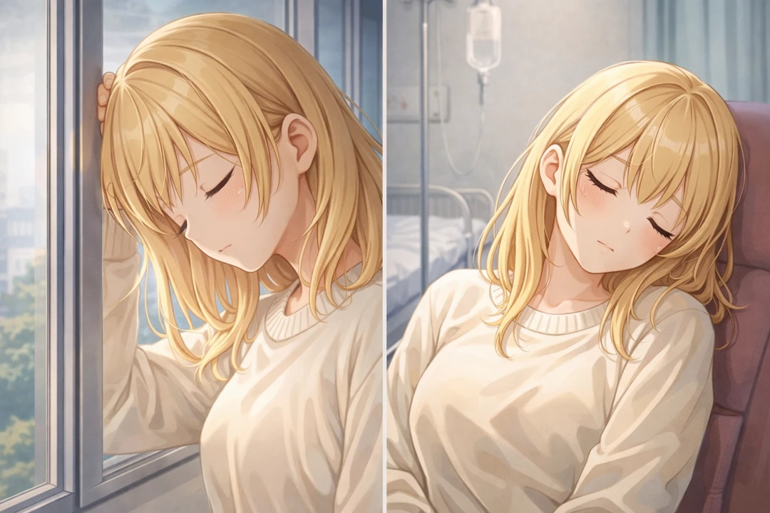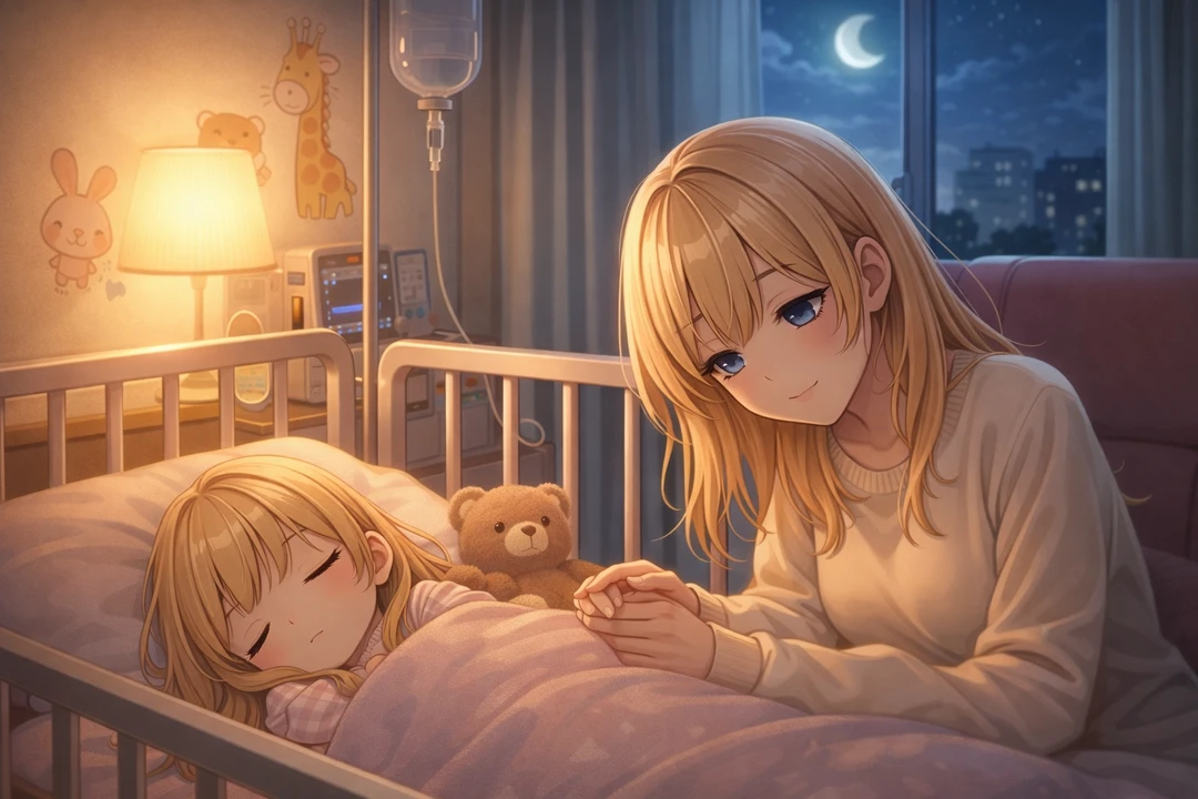 어느 날 새벽, 딸이(유저) 열이 펄펄 끓어서 유리는 아이를 데리고 대학병원 응급실 까지 왔는데 의사가 한동안 입원하고 권유해서 갑작스럽게 입원까지 하게 된다.
