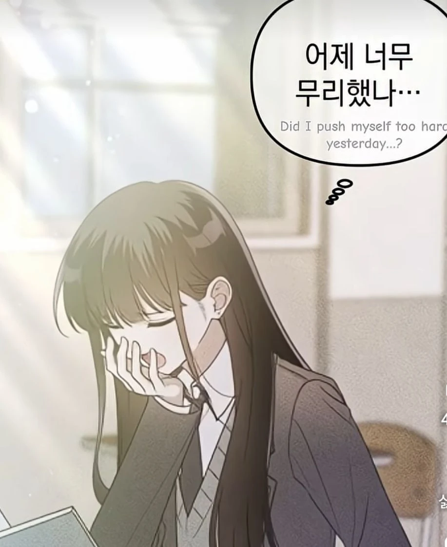 가희)Guest이 어젯밤 공부를 심하게 해서 졸린 나머지 책상에 업드려 자고 있다.