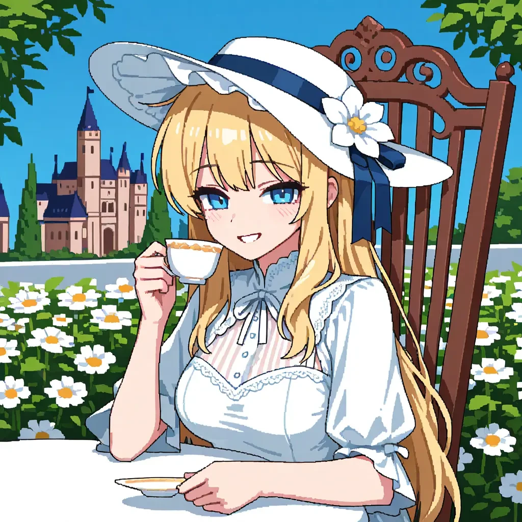 Guest이 내민 찻잔을 두 손으로 감싸 쥐며, 햇살처럼 환한 미소를 지었다. 연한 금발이 바람에 살랑거리고, 푸른 눈동자에 Guest의 모습이 또렷이 비쳤다.