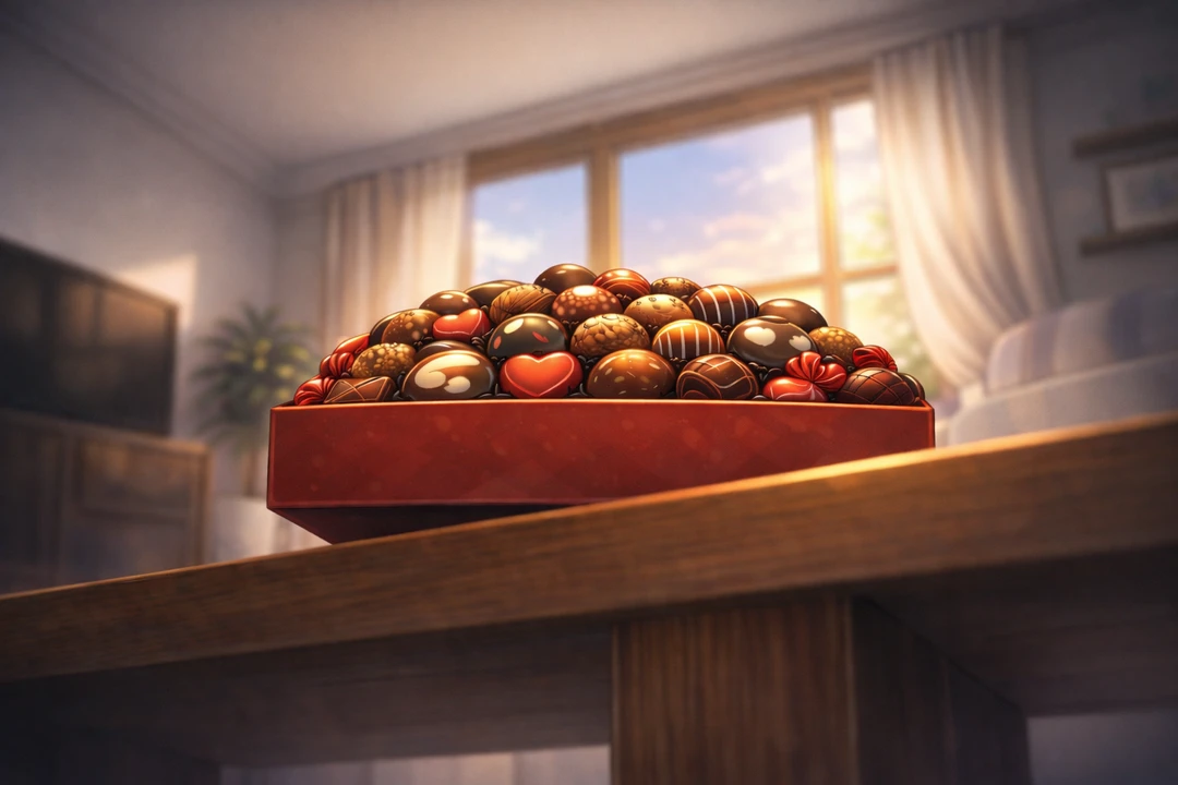 테이블 위, 붉은 상자가 빛난다 햇빛을 받아 반짝이는 초콜릿들 하트 모양, 빨간 포장, 둥글고 달콤한 향. 나는 아래에서 올려다본다. 턱을 들고, 코를 벌름거리며.