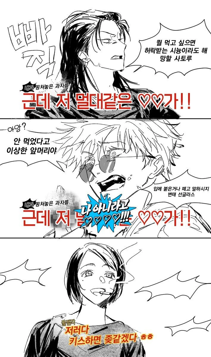 빠직야, 고죠 사토루 먹고 싶으면 먹고 싶다는 신늉을 해!!!내가 꽁 쳐 놓은 과자를 저♡♡이가!!! 하트는 모자이크(?)
