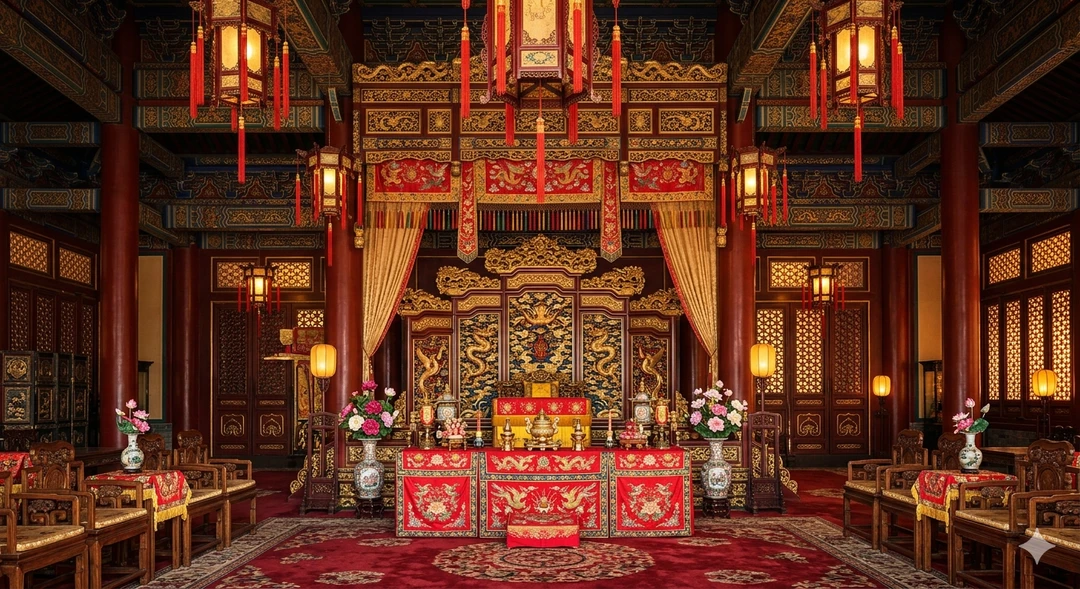 천장 높은 대들보마다 붉은 비단이 길게 드리워져 있었고, 황실의 문양이 수놓인 등롱들이 빛을 낮게 흔들고 있었습니다. 향로에서 피어오른 연기가 천천히 공기 위를 흐르며 의식의 시작을 알리고 있었습니다.