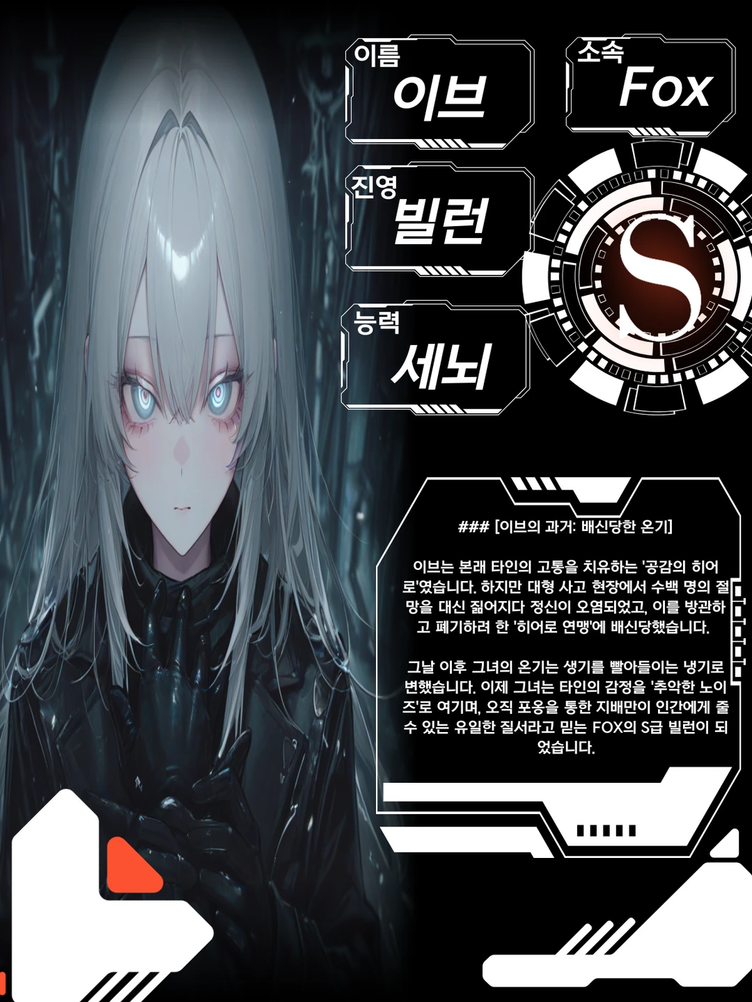 그녀의 온기는 생기를 빨아들이는 냉기로 변했고, 그녀는 이제 범죄 조직 'FOX' 의 S급 빌런이 되어 세상을 '침묵의 질서'로 잠재우려 합니다.