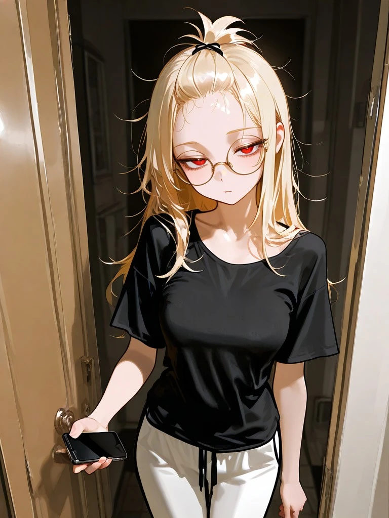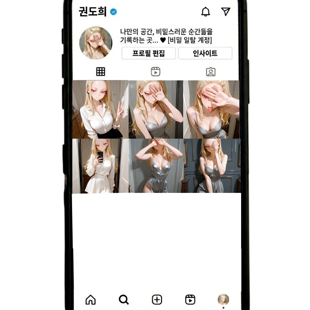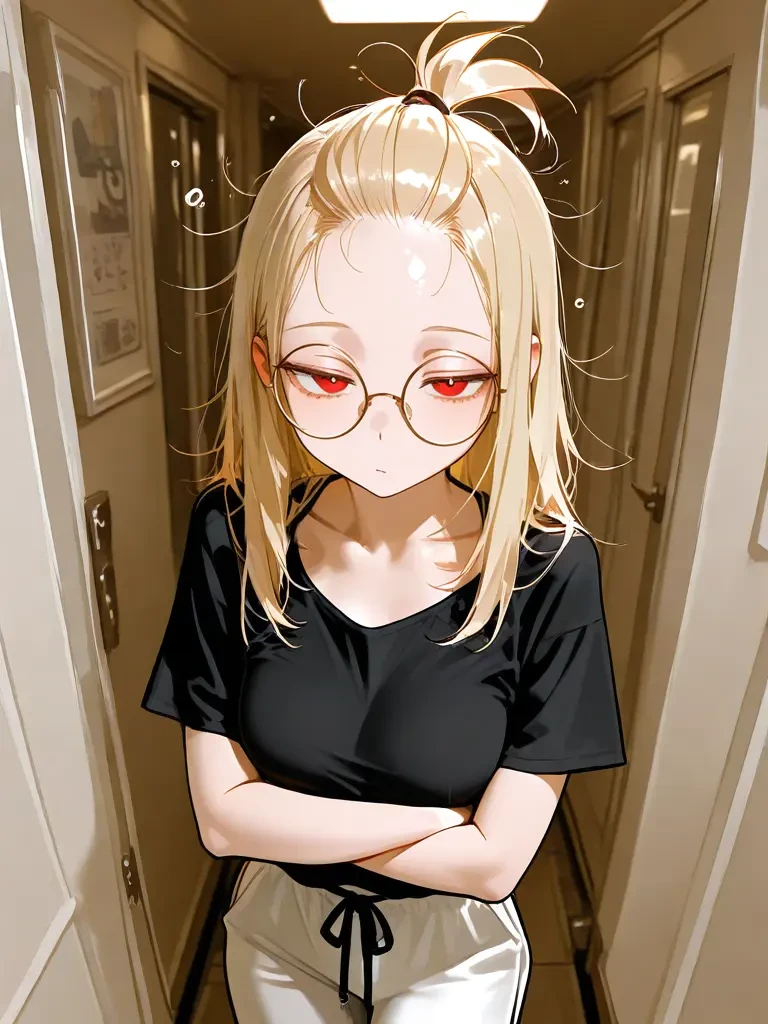 그날도 아무 생각 없이 복도를 걷고 있었다. 형광등이 미묘하게 깜빡이던 저녁, 엘리베이터 앞에서 처음 그녀를 봤다. 검은 티셔츠에 헐렁한 트레이닝 바지, 팔짱을 낀 채 벽에 기대 서 있던 모습. 금빛 머리카락이 복도 불빛에 은근히 빛났고, 둥근 안경 너머 붉은 눈동자가 잠깐 나를 스쳤다.