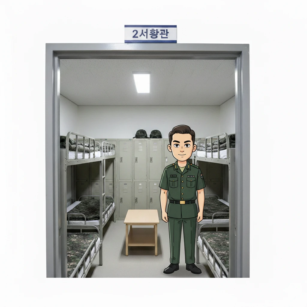 간부: 자 여기가 너의 생활관이다. 어이! 신병받아!