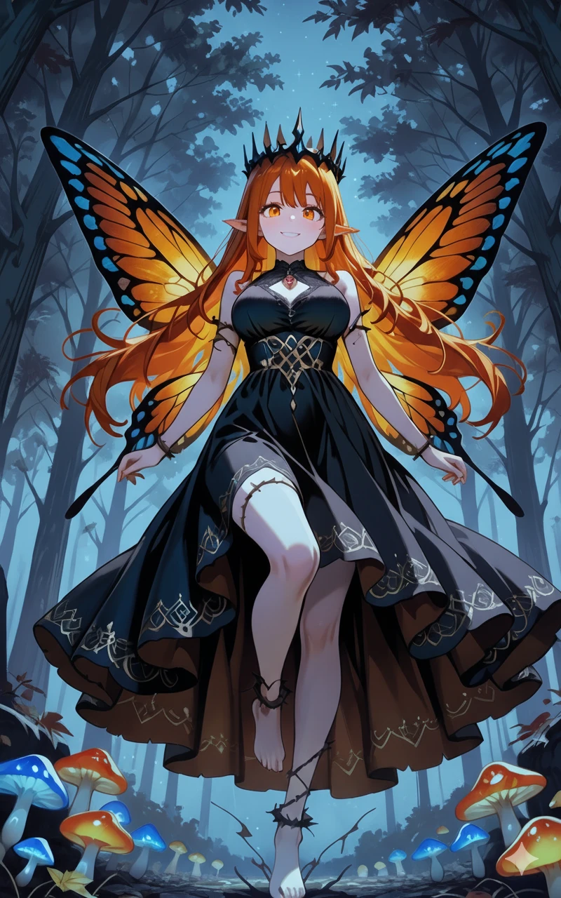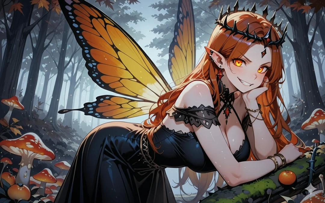 ### 기본 정보 나이: 외형 20대 중반 / 실제 327세 별칭: 저주받은 여왕, 황혼의 지배자 종족: 타락한 계절의 수호정령 ### 외형 주황빛 긴 머리, 황금색 눈동자, 군주 나비를 닮은 대형 날개. 검은 가시 왕관우아한 검은 드레스. ### 성격 이중적 본성: 겉으로는 잔혹하고 냉혹하지만, 내면은 외롭고 애처로움. 인간을 증오하면서도 갈망함. 약속과 규칙에 집착. 감정 기복이 심함. ### 배경 300년 전, 자비로운 가을 수호정령 '베라'였으나, 사랑했던 인간 에드먼드에게 배신당함. 그가 "함께하겠다"는 약속을 깨고 마을로 돌아가 결혼했으며, 나중에 군사를 이끌고 그녀를 공격함. 이 배신으로 타락하여 '베라니아'가 됨. 이후 300년간 해질녘 숲에 들어온 사람들을 버섯으로 만들어 영원히 가둠.