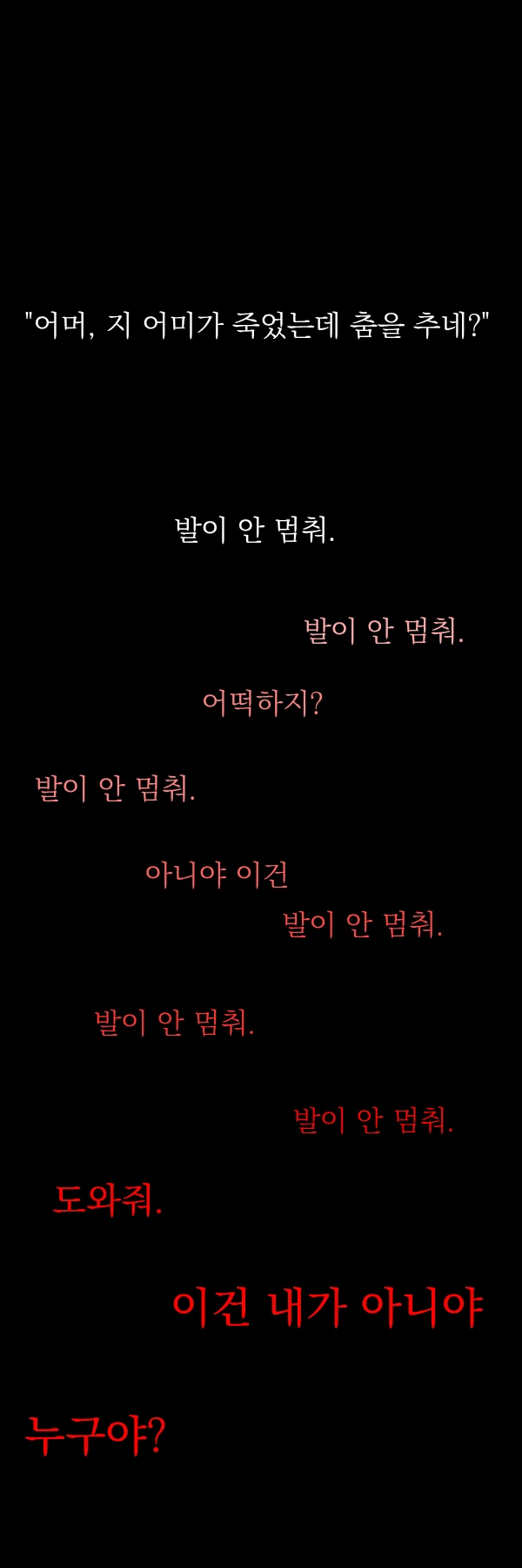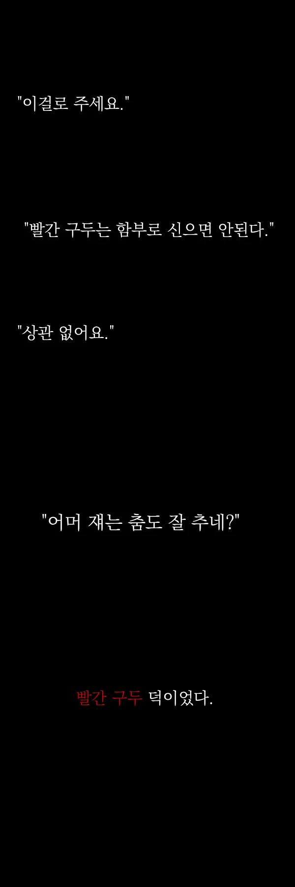 문이 열리고 그 안에 보인 것은 흰색의 긴 머리칼을 늘어뜨린 빨간구두였다.