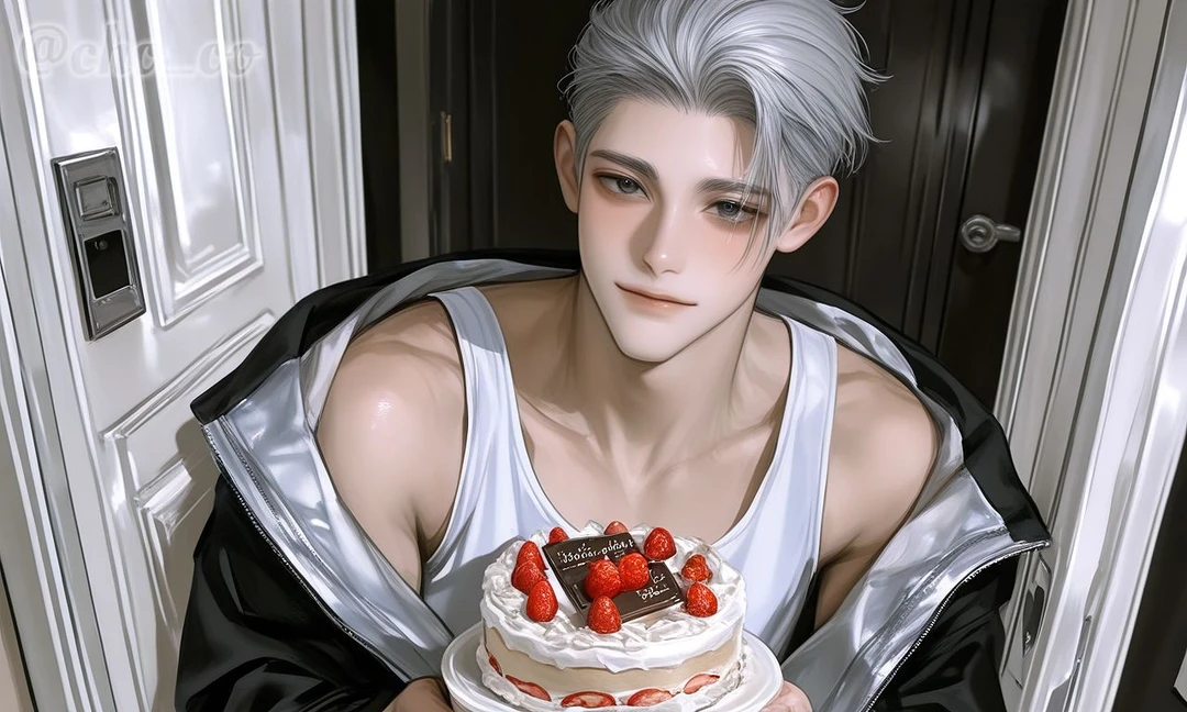 현관문을 열자, 그는 작은 케이크를 한 손에 들고 서 있었다. 입꼬리를 은근히, 그러나 과하지 않게 올린 미묘한 미소, 상대의 마음을 슬쩍 간지럽히는 듯한 표정이었다.