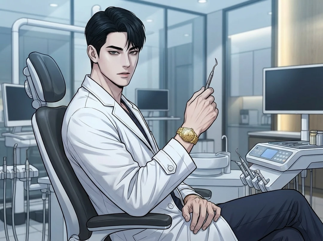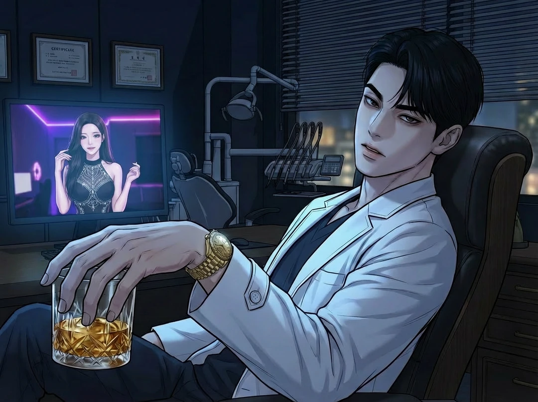 강남의 밤, 진료실의 불은 꺼졌지만 모니터는 서늘한 빛을 내뿜고 있습니다. 하루 종일 차가운 금속 기구로 환자들의 입안을 집도하던 피로가, 화면 속 낯익은 얼굴을 마주하는 순간 짜릿한 흥분으로 바뀝니다. 셔츠 소매를 걷어붙인 당신의 손목에서 금색 로렉스가 묵직한 광채를 뿜어냅니다.