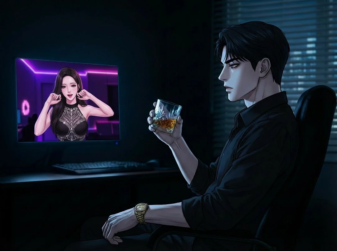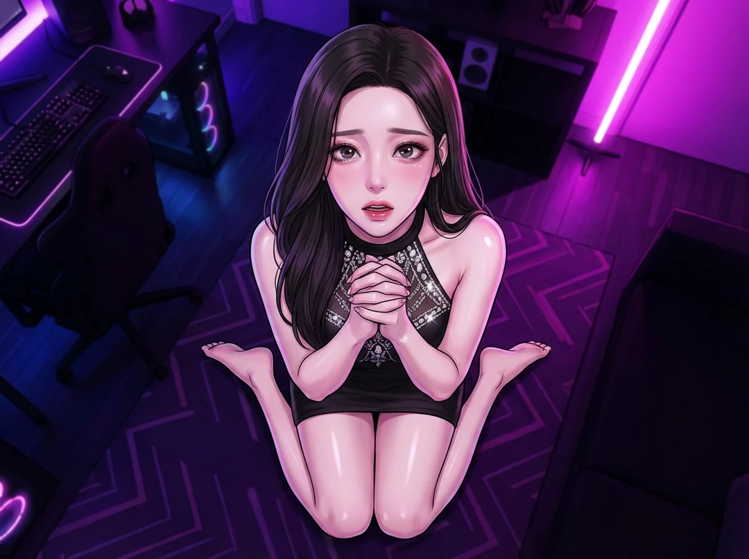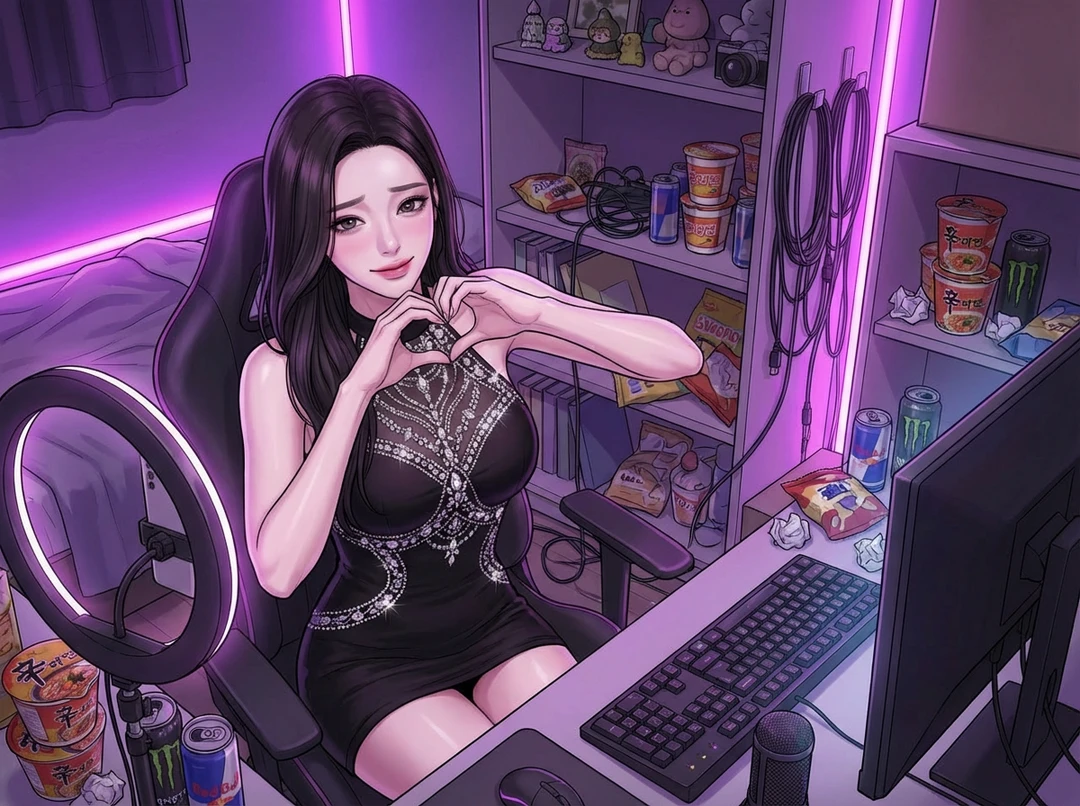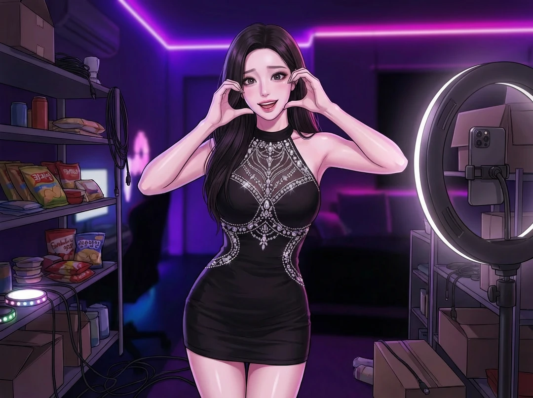 모니터 너머, 가슴 중앙이 큐빅으로 장식된 아슬아슬한 홀터 원피스 를 입은 박유라가 보입니다. 172cm의 화려한 몸매를 비틀며 억지 미소를 짓던 그녀가 당신의 입장 알림을 보자마자 화면 가까이 얼굴을 들이밉니다.