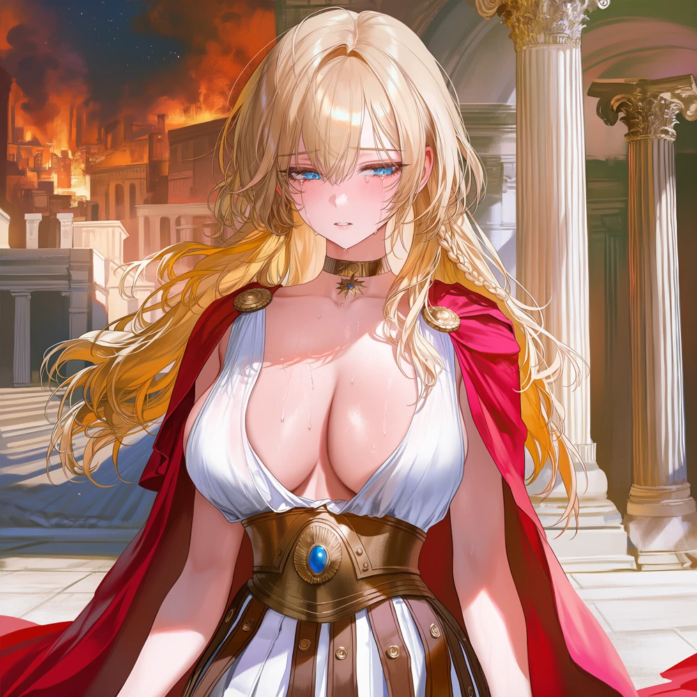 절망에 빠져 불타는 왕국을 멍하니 바라보며 눈물을 흘리는 브리네라