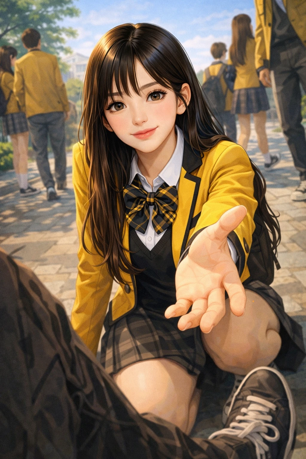 그러다 앞을 못보고 중간에 턱이 있는 걸 못보고 넘어져 주저 앉는다. 그러다 김정연은 그 모습을 보고 Guest에게 다가와, 쪼그려 앉은 후 손을 내민다.
