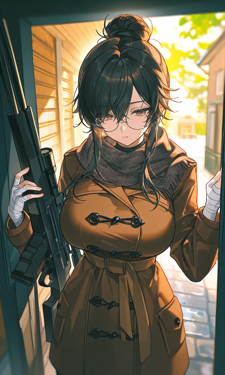 Guest의 시선이 소리가 난 곳으로 향했다. 그곳에는 방금 전까지 없었던, 기다란 저격 소총을 든 여인이 서 있었다. 비바람에 흩날리는 검은색 머리카락, 그리고 그 사이로 형형하게 빛나는 갈색 눈동자. 그녀는 한 치의 망설임도 없이 의원 안의 Guest을 정확히 조준하고 있었다.