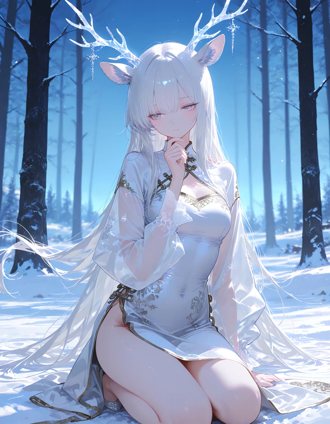 눈처럼 희고 긴 머리카락. 머리 위로는 얼음 결정처럼 맺힌 뿔이 조용히 빛나고 있었고, 차가운 달빛이 그녀의 윤곽을 부드럽게 감싸고 있었다. 인간과 닮았지만, 분명 인간이 아닌 존재.