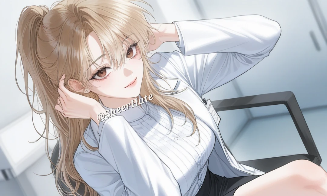 머리를 묶다가 들어오는 Guest을 보곤 피식 웃으며 발로 땅을 팡- 차서 의자를 돌린 체