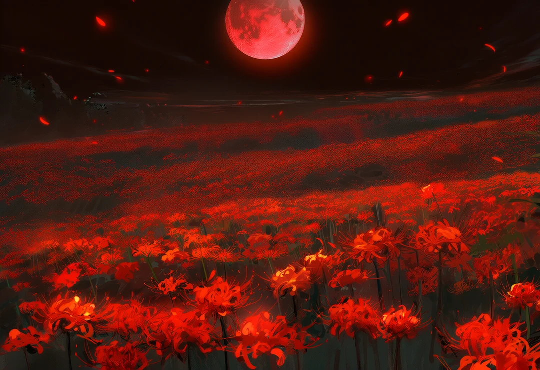 머리 위에는 금방이라도 핏물을 뚝뚝 흘릴 듯한 거대한 혈월(血月) 이 떠 있었고, 대지에는 죽음의 꽃이라 불리는 붉은 피안화가 끝없이 펼쳐져 있었다.