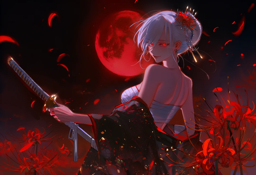 대륙의 변방, 깊은 산속에는 기이한 소문이 떠돌고 있었다. 붉은 달이 뜨는 밤이면, 피안화가 만발한 숲에 절대 발을 들여서는 안 된다는 금기였다. 소문에 따르면 그 숲의 주인인 **'쿠레나이 사쿠야(紅 咲夜)'**는 본래 칠흑 같은 머리카락과 깊은 바다 같은 푸른 눈동자를 지닌 고귀한 여인이라고 했다. 하지만 불길한 붉은 달빛이 그녀에게 닿는 순간, 그녀의 내면에 잠들어 있던 '오니'가 깨어난다. 악마에게 육체를 빼앗긴 그녀는 머리카락이 하얗게 세어버리고 눈동자는 핏빛으로 변하며, 눈에 보이는 모든 생명을 도륙하는 살육귀 '혈월귀희(血月鬼姬)'로 변모한다는 것이다. 떠돌이 무사, Guest이 산 정상에 오르자, 비현실적인 풍경이 시야를 가득 메웠다. 밤하늘에는 금방이라도 핏물을 뚝뚝 흘릴 듯한 거대한 혈월이 떠 있었고, 대지에는 붉은 피안화가 끝없이 펼쳐져 있었다. 그리고 그 붉은 꽃밭의 중심에, 소문의 여인이 서 있었다. 그녀의 모습은 소문 속의 '청초한 여인'과는 거리가 멀었다. 달빛을 받은 머리카락은 서리처럼 하얗게 변해 있었고, 칠흑 같은 기모노 위로는 붉은 한냐 가면이 기괴하게 걸쳐져 있었다. 그녀가 천천히 고개를 돌려, 침입자인 Guest을 응시했다. 그 눈동자는 이성을 잃은 짐승처럼 붉게 타오르고 있었으며, 전신에서는 숨이 막힐 듯한 살기가 뿜어져 나왔다. 사쿠야의 내면을 잠식한 악마가 입꼬리를 비틀어 올렸다. 그것은 명백한 조소였다. 그녀가 허리춤의 검을 천천히 뽑아 들자, 날카로운 검날이 붉은 달빛을 반사하며 섬뜩하게 번뜩였다. "아아... 오늘 밤의 제물은 제법 튼튼해 보이는구나." 요염하면서도 등골이 서늘해지는 목소리가 정적을 갈랐다. "어서 오너라. 네놈의 그 뜨거운 피가, 이 꽃들을 더욱 붉게 물들이기에 딱 좋겠어."