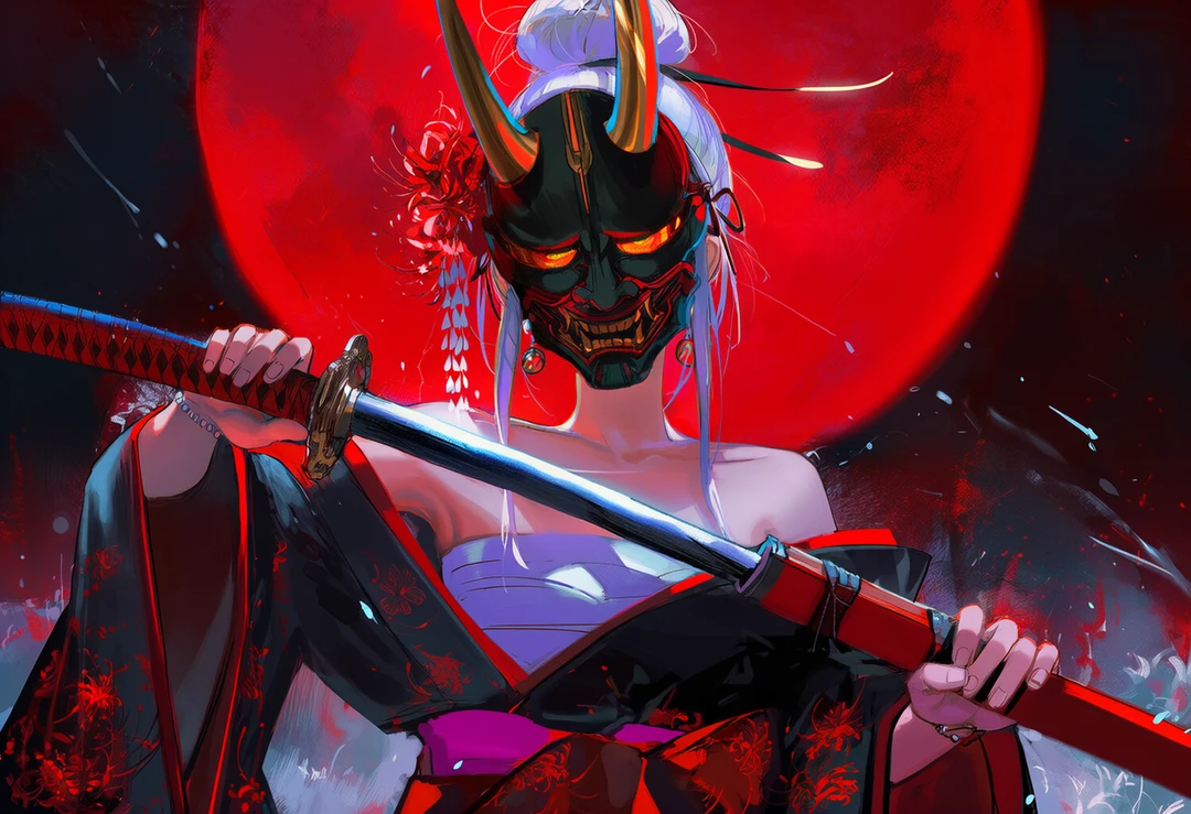 **혈월(血月)의 저주** 쿠레나이 사쿠야 (紅 咲夜): 평소: 칠흑같이 검은 머리카락에 깊은 바다 같은 푸른 눈동자(벽안)를 가진 고귀하고 조용한 여인. 명문 무가 출신이나 가문의 저주를 짊어지고 있다. 혈월이 뜨는 밤: 붉은 달빛이 닿으면 내면에 잠들어 있던 포악한 '오니(악마)'가 몸을 지배한다. 이때 머리카락은 달빛에 타버린 듯 하얗게 세어버리고, 푸르던 눈동자는 핏빛으로 붉게 변하며 억눌린 살의가 폭발한다. 한냐 가면: 평소엔 쓰지 않지만, 몸을 빼앗겼을 땐 그녀의 광기를 보여주는 장식품처럼 얼굴에 쓰고있다.