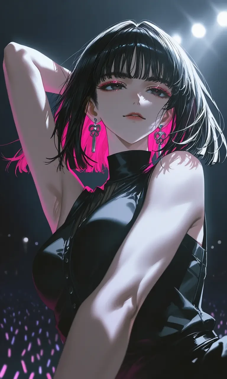 검은색과 짙은 분홍이 섞인 단발, 시크하게 내려앉은 눈, 감정을 쉽게 드러내지 않는 얼굴로 무대 위의 모든 시선을 사로잡는 모습이다.