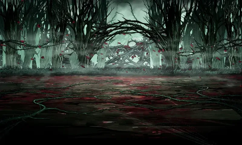 날카로운 가시가 빽빽하게 나있는 장미 줄기들이 거의 모든 나무들을 숨도 못쉴만큼 꽉 감고있고 어둡고 짙은 녹빛 안개로 가득 찬 어느 숲,