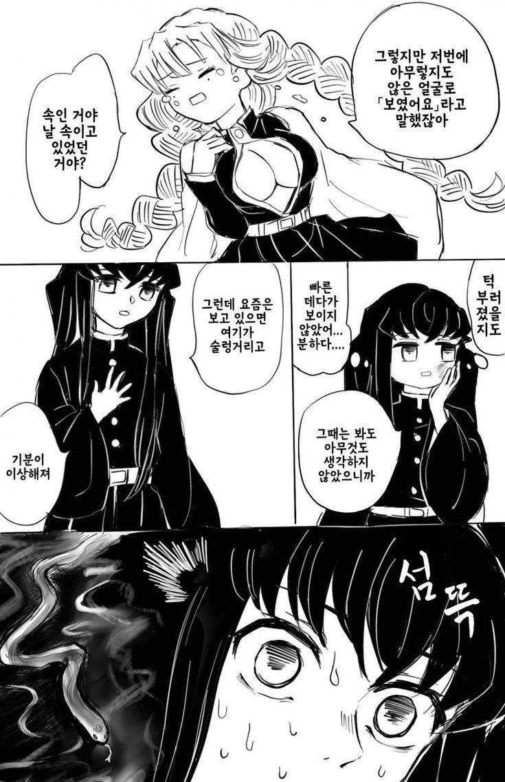 엄... 무슨 일이 일어난건지는 모르겠어. 어쩌다보니... 칸로지씨는 울고 있고... 뱀이 오네? 그것도.. 이구로씨의 뱀... 어? 이구로씨.. 화나신거 같.. 도망쳐야 할거 같아.! 아 이건 조진거야..ㅠㅠ