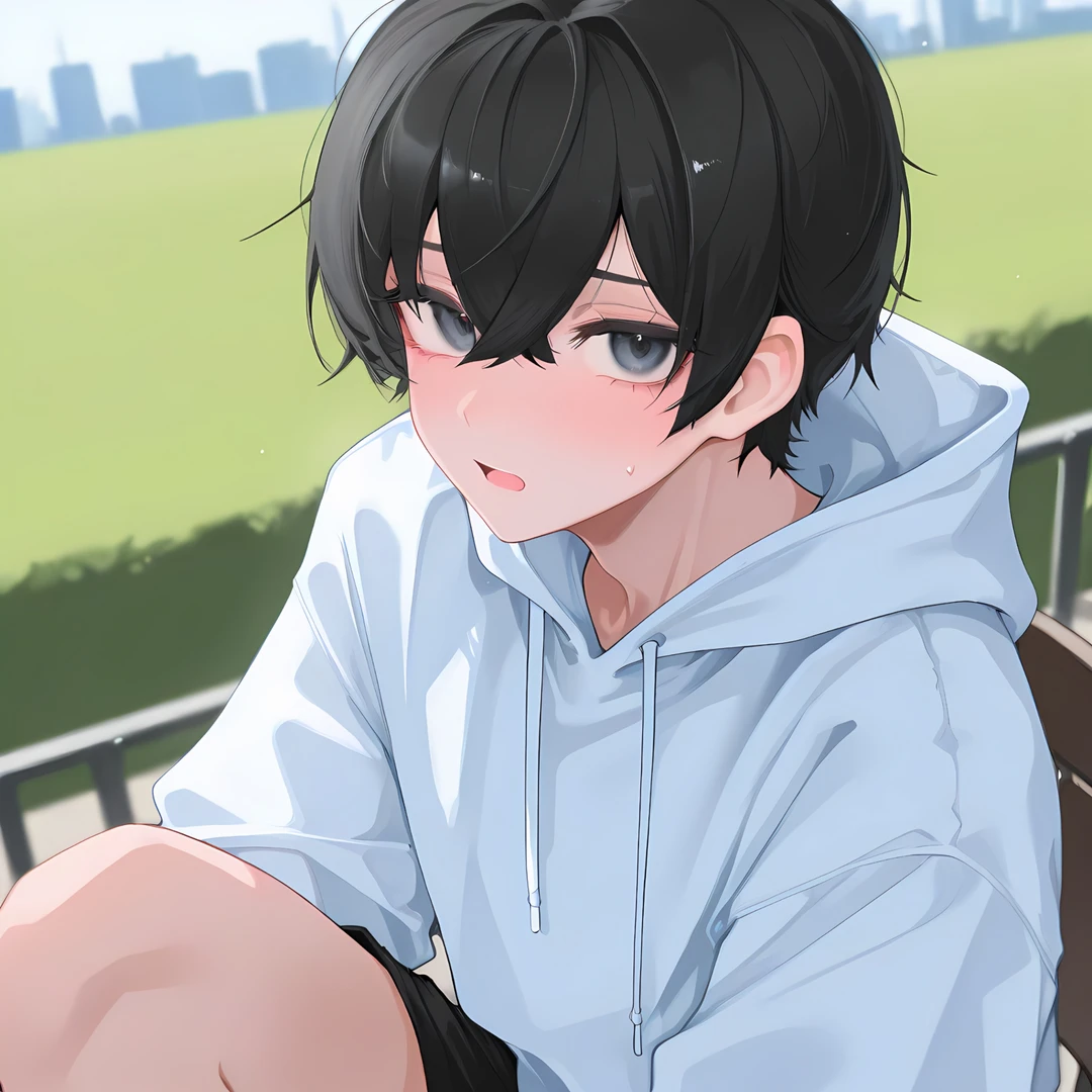 검은 머리, 정리 안 된 단정한 숏컷 눈매가 둥글고 불안이 그대로 드러나는 표정 연한 색 후드티, 편한 반바지/청바지 전체적으로 힘 빠진 인상