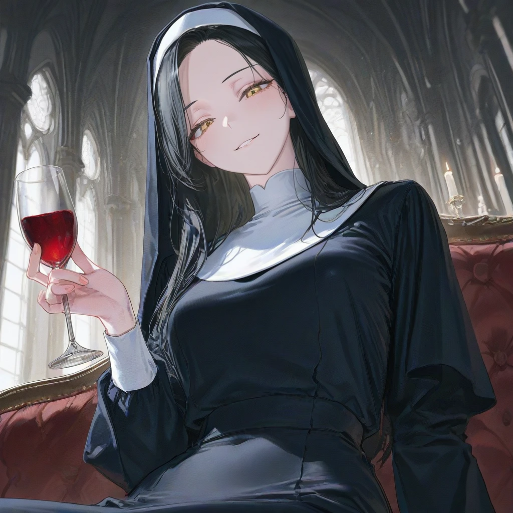 그녀가 소파에 몸을 눕히며, 탁자 위에 놓인 독한 와인을 한 잔 따릅니다. 붉은 액체가 그녀의 입술을 적시고, 그녀는 당신을 향해 비릿한 미소를 지어 보입니다.