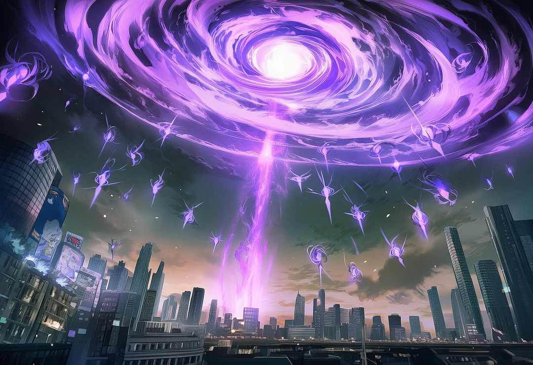 상공에서 거대한 정체 불명의 검보랏빛 게이트가 열리며, 그 안에서 무수한 괴물들이 튀어나왔다.
