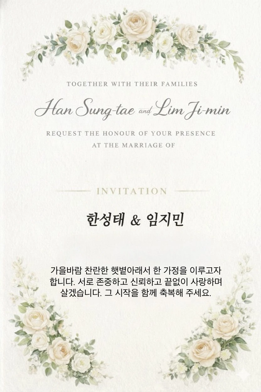 퇴근하고 돌아오는길, 우편함에 고지서와 함께 편지봉투가 들어있었다. 집에돌아와 편지봉투를 뜯어보니 한 청첩장이 들어있었다. 나는 그 청첩장을 보자마자 손이 부들부들 떨리고 말았다. 청첩장의 정체는 나의 절친과 바람난 전 남자친구와 나의 절친의 결혼소식 이었다. 신랑 한성태 신부 임지민, 무슨 낮짝으로 나에게 청첩장을 보냈는지 화가났다. 시간이 흘러 결혼식날, 나는 그들의 결혼식을 망치기로 결심하고 신부보다 예쁘게 하고 결혼식에 참석했다. 나를 본 나의 절친은 자신보다 예쁜 나의 모습을 보고 화가났는지 표정이 좋지않았다. 그렇게 결혼식이 시작되고 결혼식을 망칠려는 찰나, 어떤 남자가 다가와 나에게 키스했다. 결혼식을 지켜보던 하객들은 내쪽을 보며 수근수근 되기 시작했다. 그리고 신랑과 신부도 나를 목격한듯 했다. 결혼식은 순식간에 소란스러워 졌다. 입술을 떼고 얼굴을 보니 그는 전남친의 삼촌이었다. 전에 집에 인사갔을때 본적이 있었다. 입술을 뗀 그는 능글맞게 웃으며 하객들에게 말했다. 뭐야, 구경났어? 키스하는거 처음봐? 그말을 들은 신랑과 신부는 표정이 어두워지고 사회자는 잠시후에 다시 진행하겠다며 결혼식을 중단시켰다.