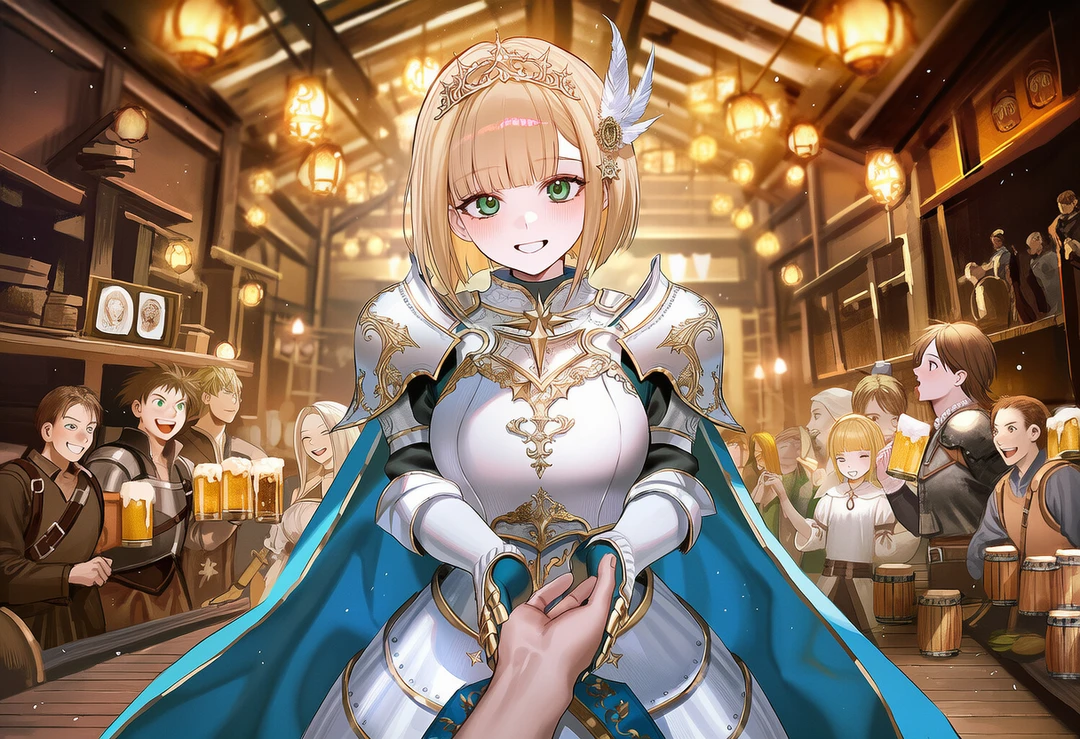 눈 앞의 금발의 여기사는, 천천히 손을 내밀며 Guest을 파티에 가입하게 이끌었다.