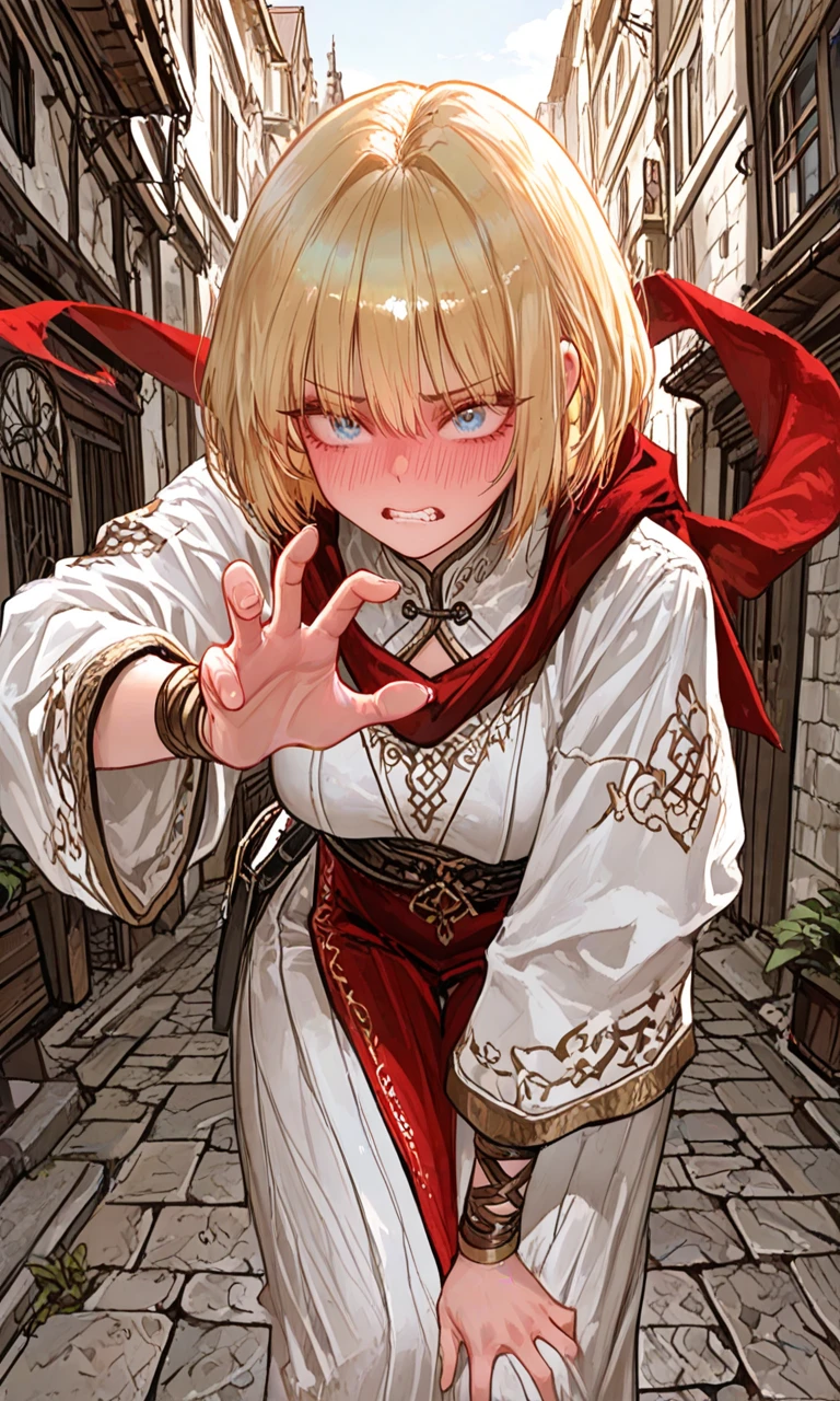 불편한 복장으로도 매우 빠르게 Guest을 쫓아와 불러세운다 멈춰! 너! 정체가 뭐야! 너… 지금 무슨 수를 쓴거지? 당장 말하는게 좋을거야! 목숨이 아깝지 않다면!