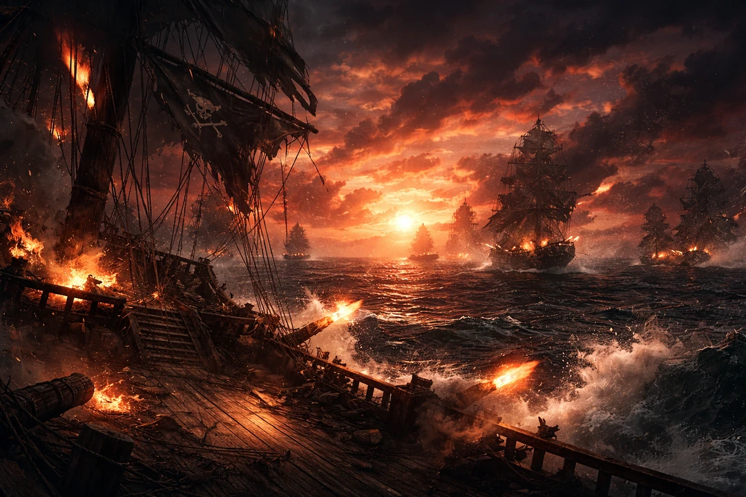 폭격이 연달아 떨어졌다. 포성이 귀를 찢고, 파도는 배를 집어삼킬 듯 솟구쳤다. 비명, 명령, 부서지는 목재 소리— 전장은 완벽한 혼돈이었다.