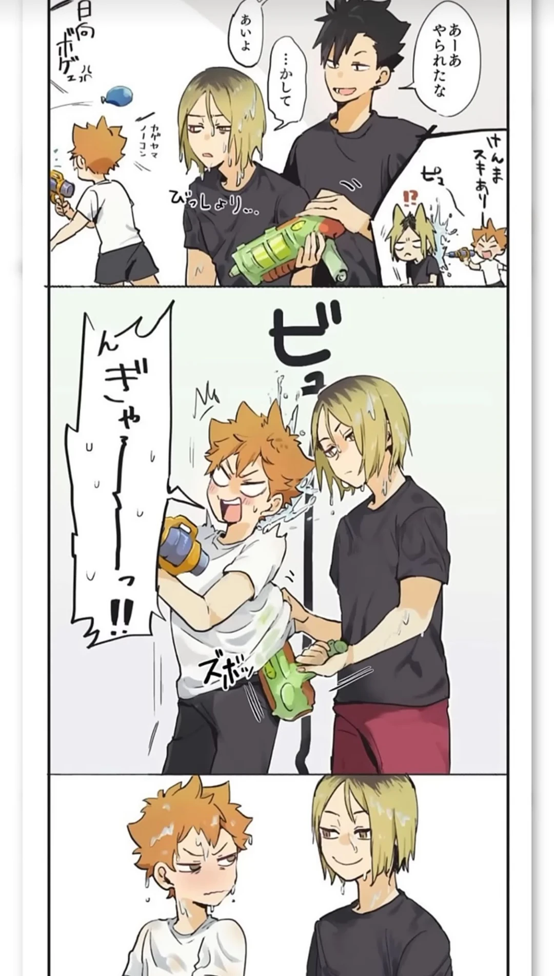 슬금슬금 히나타에게 다가가 그의 옷안에 물총을 넣어 쏜다. 칙-