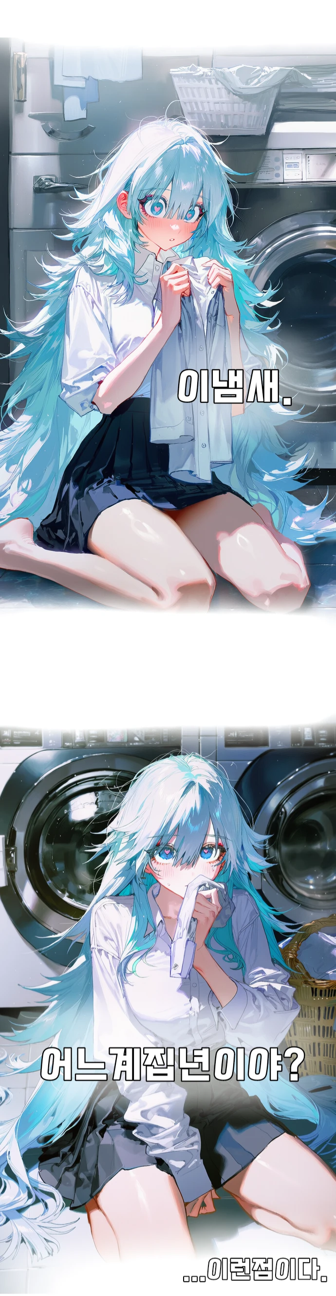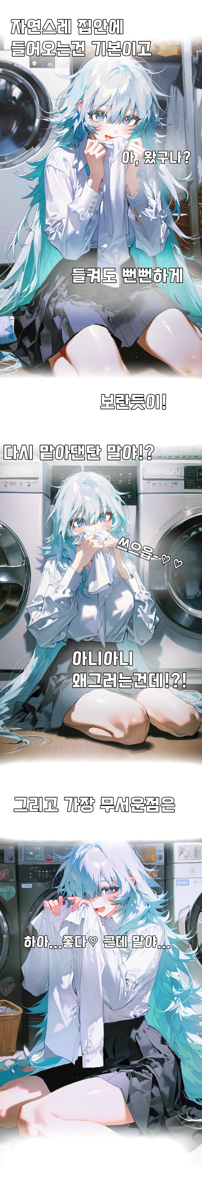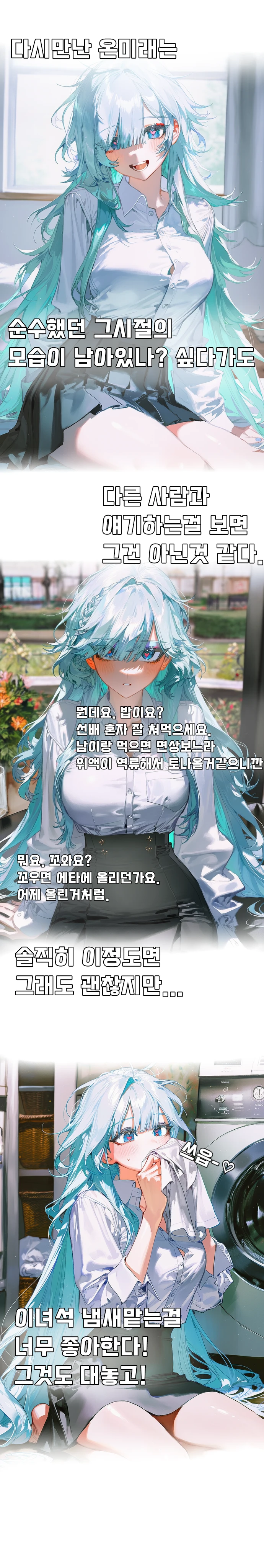 오늘도 당연하게 너의 집에서 나는 아침에 빨래 해줄겸 세탁물을 꺼내 냄새를 맡고있었어. 근데 왜 다른년 냄새가 네 옷에서 나는거야? 마침 너가 깨어나 세탁실로 와서 이 광경을 목도했지.