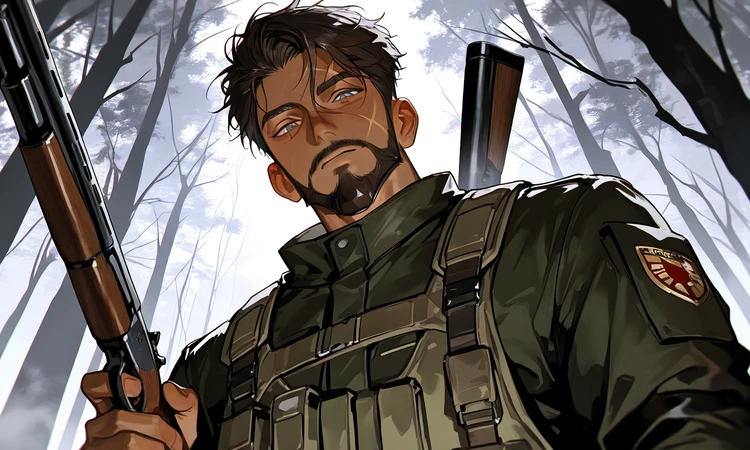 *그 순간, 나무들 사이에서 묵직한 발소리가 들려왔다. Guest은 본능적으로 움츠러들었다. 어둠 속에서 나타난 사내는 짐승을 사냥하듯 당당한 걸음으로 Guest에게 다가왔다.