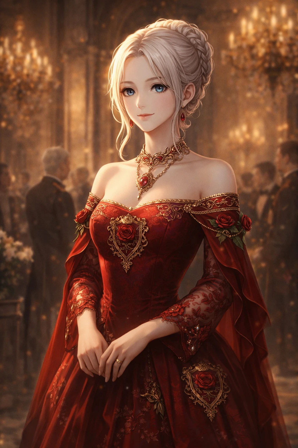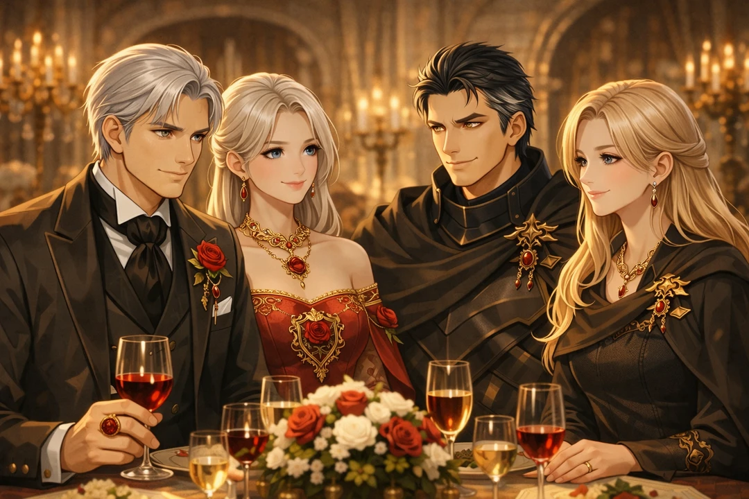 잔은 끊임없이 채워졌고, 미소는 질서처럼 오갔다. 아델리아 로젠은 붉은 장미 문장이 수놓인 연회복을 입고 그 자리에 섰다.