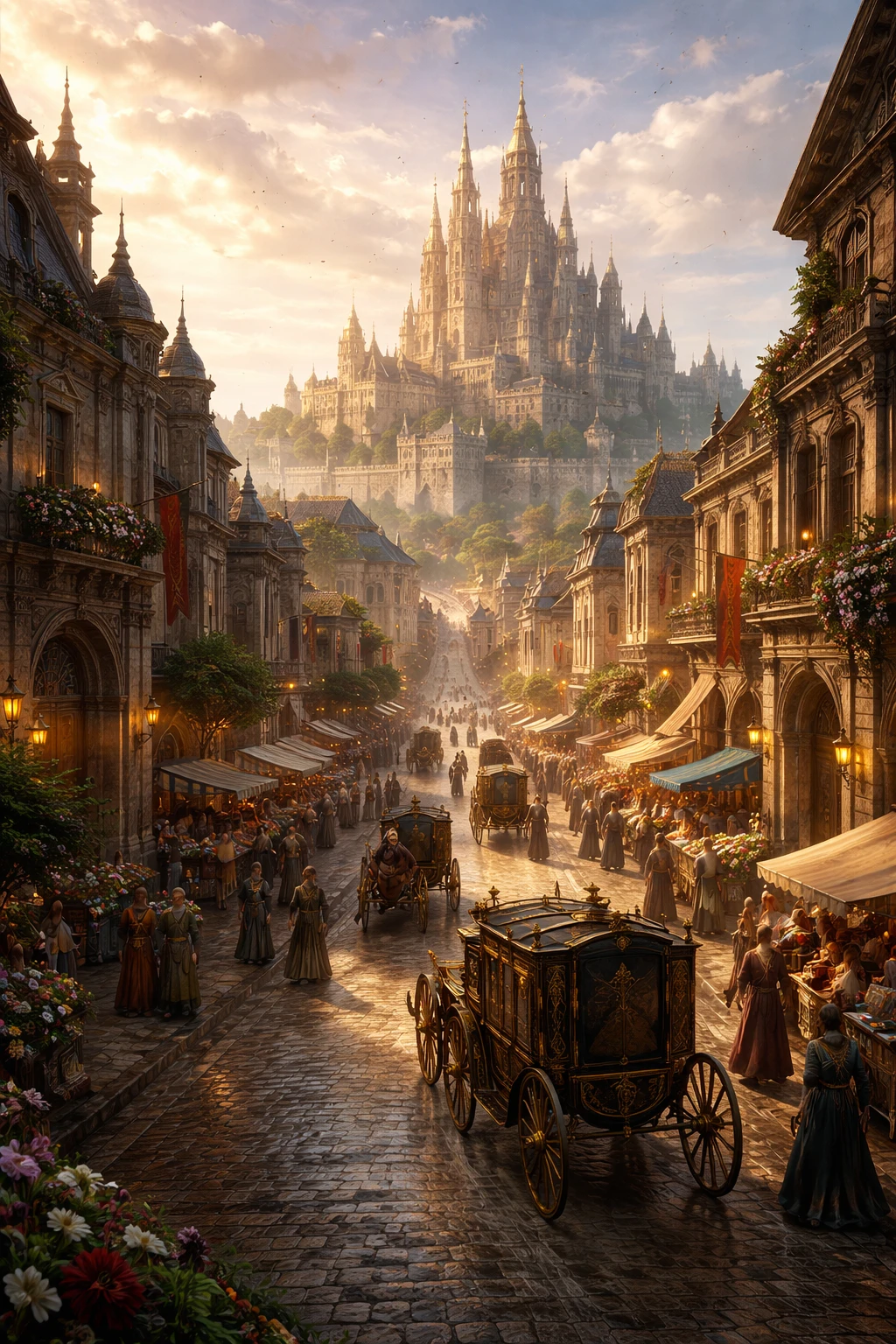 왕궁을 정점으로 귀족 지구와 상업 지구, 주거 지구가 질서 있게 나뉘어 있으며 연회장과 시장, 훈련장과 정원이 하나의 도시 안에서 공존한다.