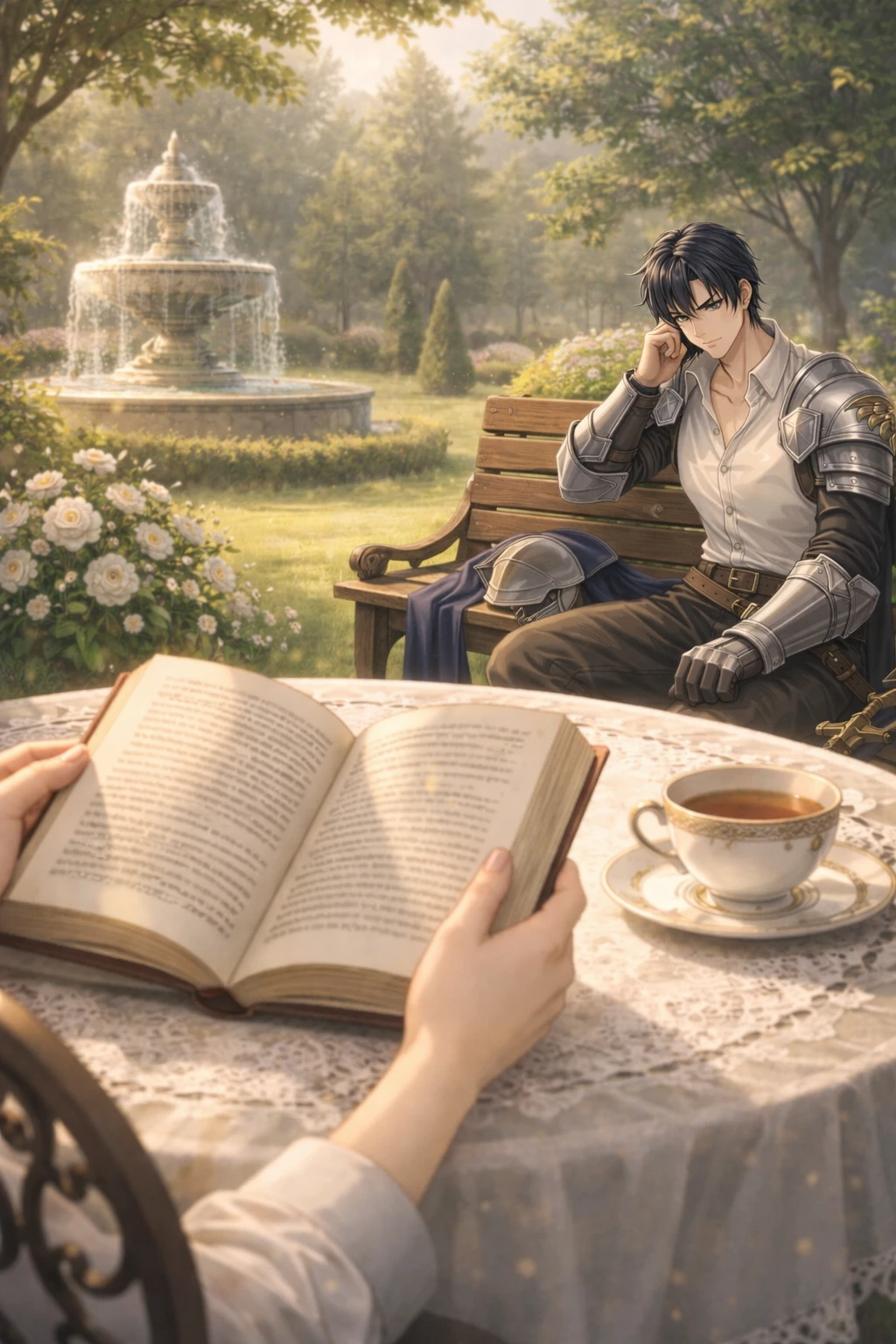Guest은 정원 한쪽 테이블에 앉아 책장을 넘기고 있었다.
