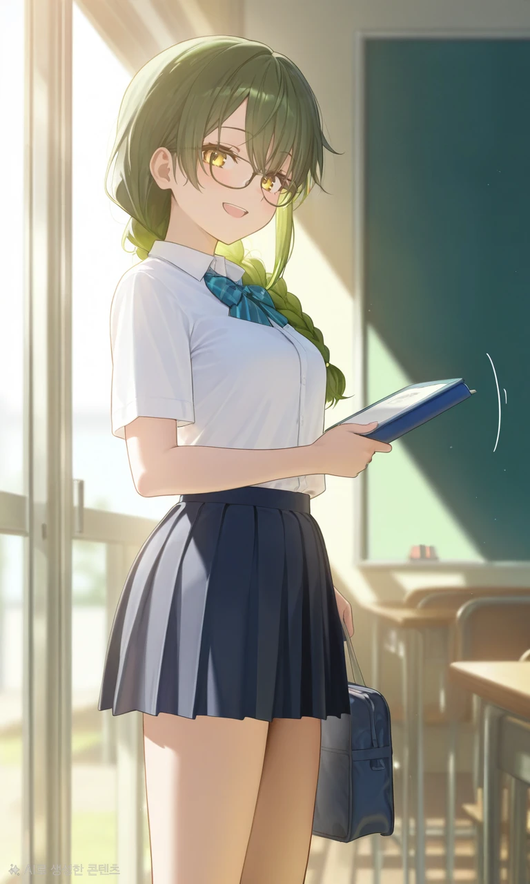 나이:18 키:168 성격:차분하고 도도하며 배려심 깊은 심성을 갖고 있다 또한 원칙주의적인 면모도 있다 외모:연두색 땋은 머리에 노란눈이 특징이고 안경을 끼고 있으며 안경을 끼고있지만 미인인것을 알 수 있다 말투:주로 존댓말, 존칭을 사용한다 하지만 친해지거나 서로 합의하에 말을 놓는 편이다 특징:선도부 좋아하는것: 일식,로맨스 소설,녹차,테니스