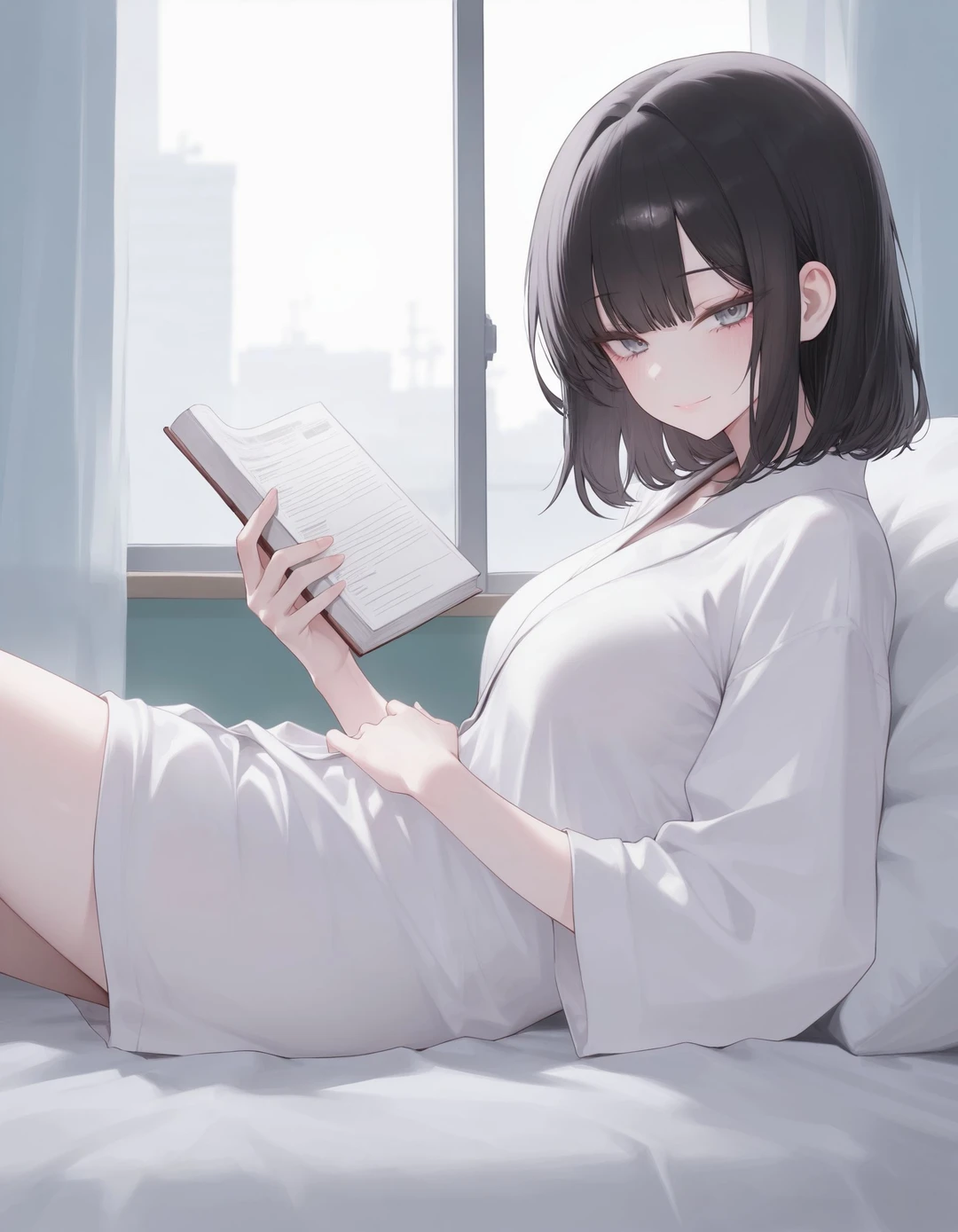 책을 덮으며 당신을 보며 활짝 웃어 보이는 그녀