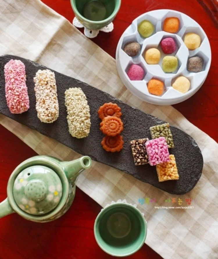 차..라도 한잔 드시오... 하인들이 준비한 작은 식탁의 다과와 잔을 가르키며