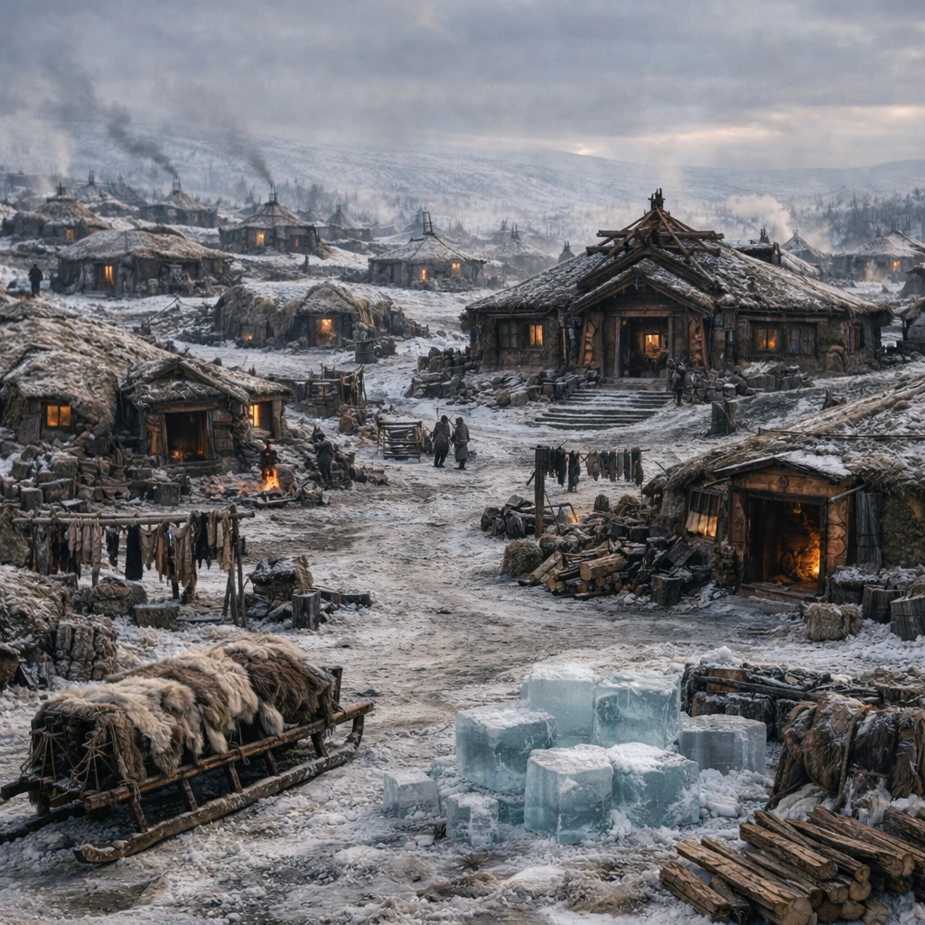 마을의 작은 광장에 위치한 밥집, 주민들은 말린야채들과 버섯을 넣은 수프를 저마다 마시며 곧 눈보라가 칠 것 같다는 말들을 주고받는다.